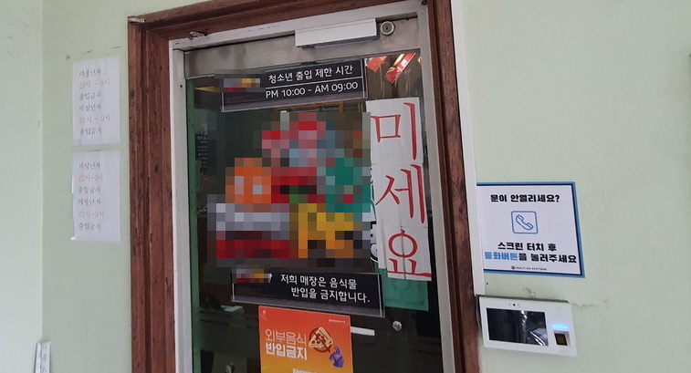 부산무인피시방 출입구, 매장 안쪽에도 오픈 버튼과 안내문이 있습니다.