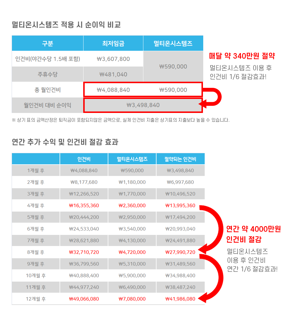 멀티온시스템즈 PC방 무인관제시스템 이용 시 야간 인건비를 약 1/6 수준으로 절약할 수 있습니다.