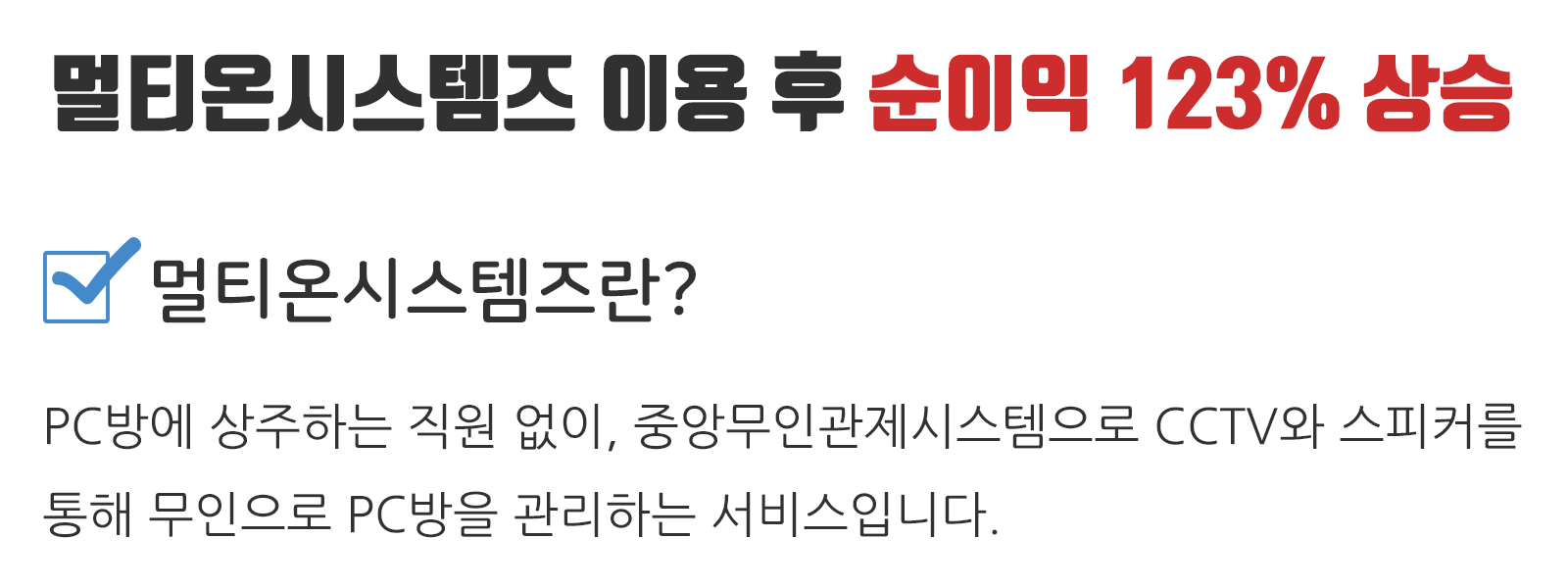 | 멀티온시스템즈 전국 pc방 무인관제시스템 무료설치! 무인관제pc방으로 인건비 절약! (0) | 2019.11.11 |