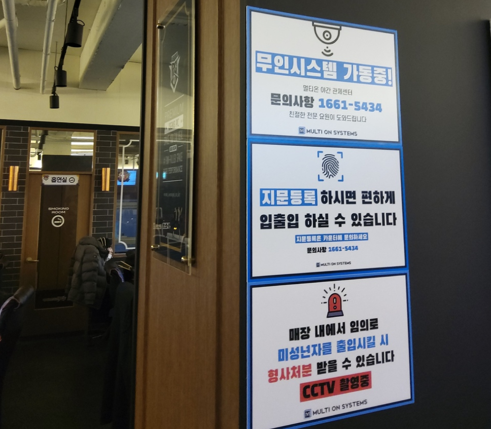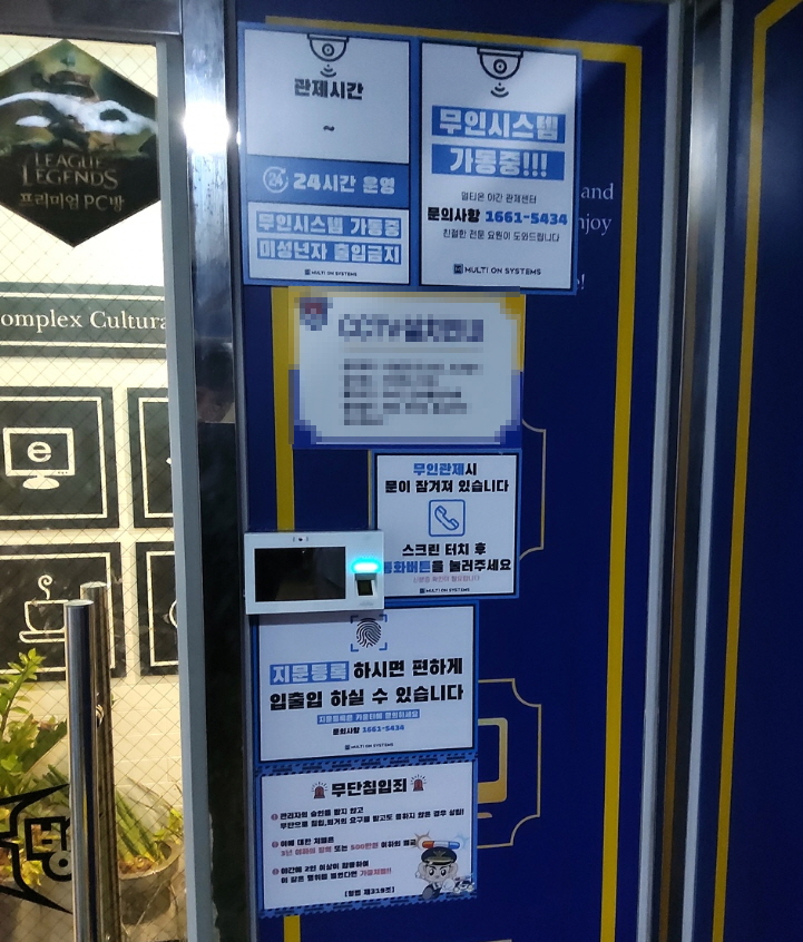 멀티온시스템즈 무인관제PC방은 출입문관리, 매점관리, 카운터관리, 매장전반에 흡연이나 오염발생 여부 등으 관제하고 있습니다. 야간무인피시방은 출입문이 잠겨 있으며, 등록 회원들은 지문인증을 통해 출입할 수 있습니다. 신규방문객은 CCTV를 통해 신분증 확인 후 관제실에서 문을 열어드리기 때문에 야간미성년자 출입을 차단할 수 있습니다.