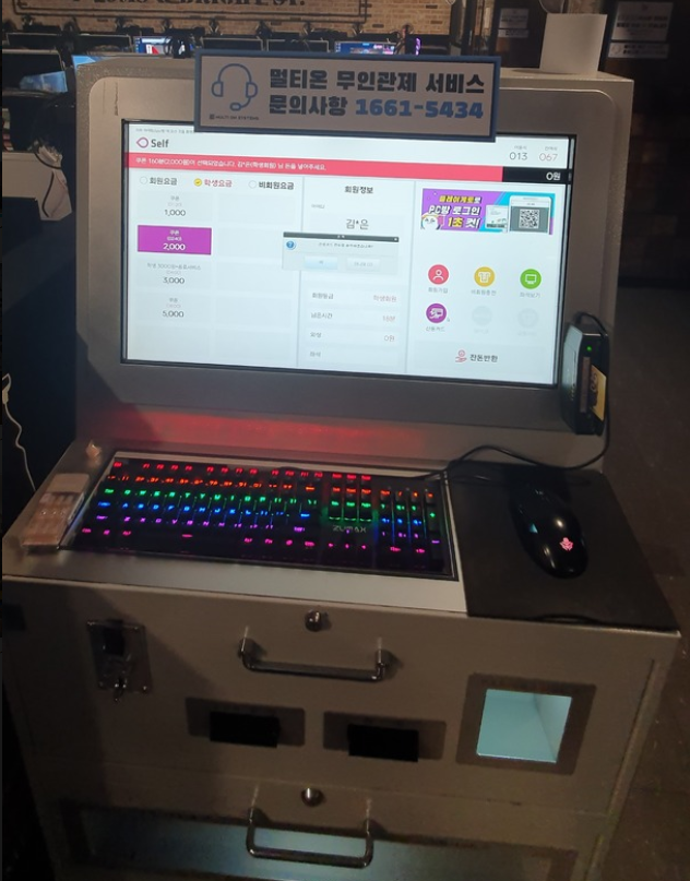 인천셀프PC방 요금 충전기에도 멀티온시스템즈 안내문이 붙어 있습니다.