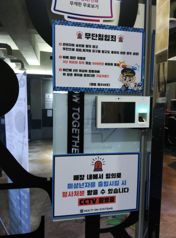 무인관제시간 동안 천안시 동남구 무인PC방 출입문은 잠겨 있습니다. 기존 회원분들은 지문등록 후 자유롭게 출입할 수 있으며, 신규방문객은 CCTV 를 통해 신분증 확인 후 관제실에서 문을 열어드립니다.