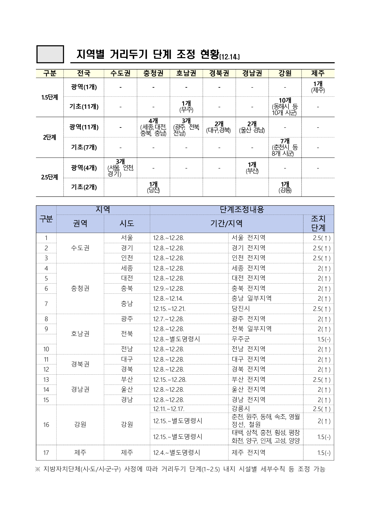 12월 14일 월요일 기준 지역별 사회적거리두기 단계입니다.