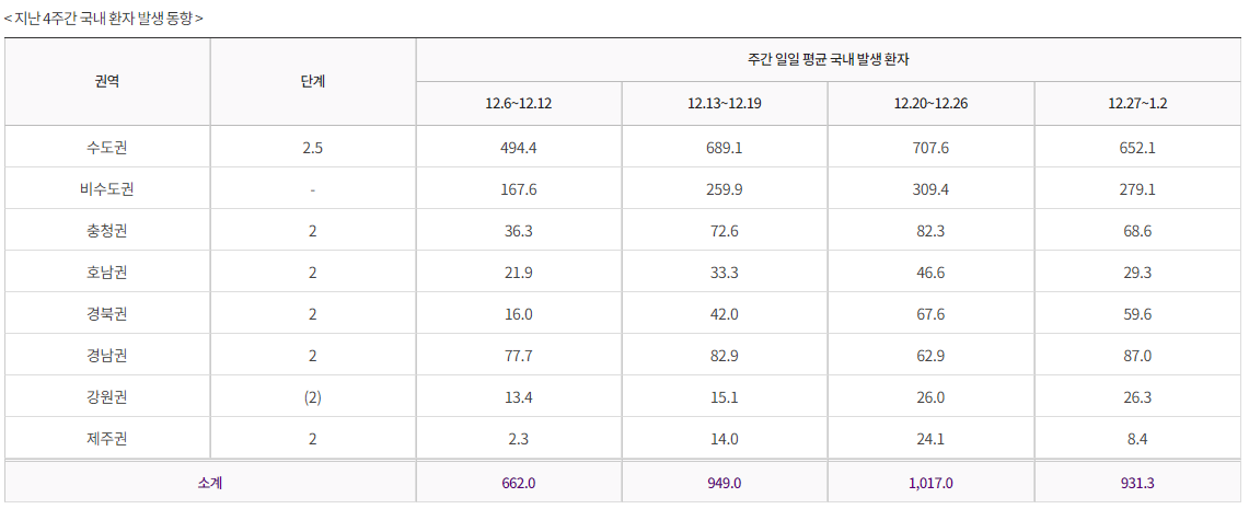 코로나19 일일 평균 국내발생 환자 수는 사회적거리두기 2.5단계가 시행된지 2주일 째되는, 12월 4주차를 정점으로 하락세로 돌아섰습니다. 하지만 아직까진 확진자 수가 많은 편이라 사회적거리두기 1월 17일 (일) 까지 연장하기로 했습니다.