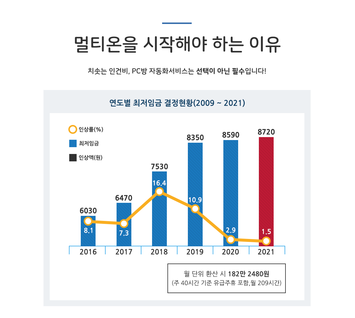 2021년 최저임금은 전년대비 1.5% 인상된 8720원입니다.