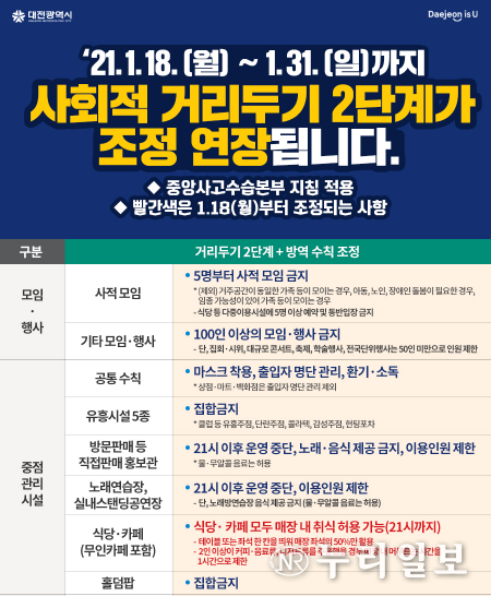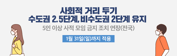 중대본은 현행 사회적 거리두기 단계를 1월 18일 0시부터 1월 31일 24시까지 2주간 연장하기로 결정했습니다. 또한, 다서명 이상 사적 모임 금지 조치도 2주가 연장 합니다.