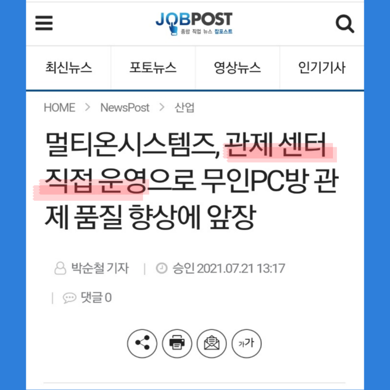 잡포스트 박순철 기자 무인 관제 업체 멀티온시스템즈는 본사에서 관제 센터를 구축하고 직접 운영함으로써 무인 PC방 관제에 대한 불신을 해소하고 무인 관제의 품질 향상에 앞장설 것이라고 20일 밝혔다 멀티온시스템즈는 본사에 중앙 관제 시스템을 갖추고 전국에 있는 피시방을 실시간으로 원격 관리하는 무인 관제 업체다 주목할 만한 점은 관제센터를 외주 회사에 위탁하지 않고 본사에 구축하여 직접 관제를 진행하고 있으며 모든 직원을 정규직으로 채용함으로써 관제에 임하는 책임감을 높이고 숙련도와 전문성을 향상시켜 차별화된 관제 서비스를 제공하고 있다는 것이다 동시에 사고 재발 방지를 위한 관제 교육을 매주