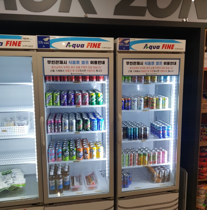 모든 냉장고에는 무인관제시스템이 운영되고 있다는 안내문이 붙어 있습니다.