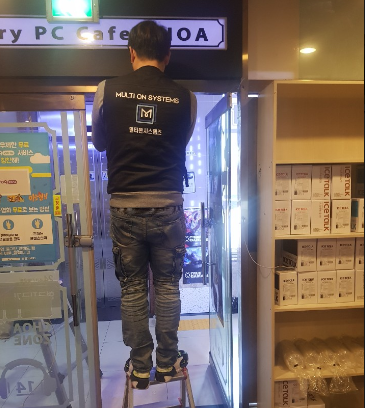 광주무인pc방 출입구에 CCTV를 설치하고 있는 멀티온시스템즈 설치팀입니다.