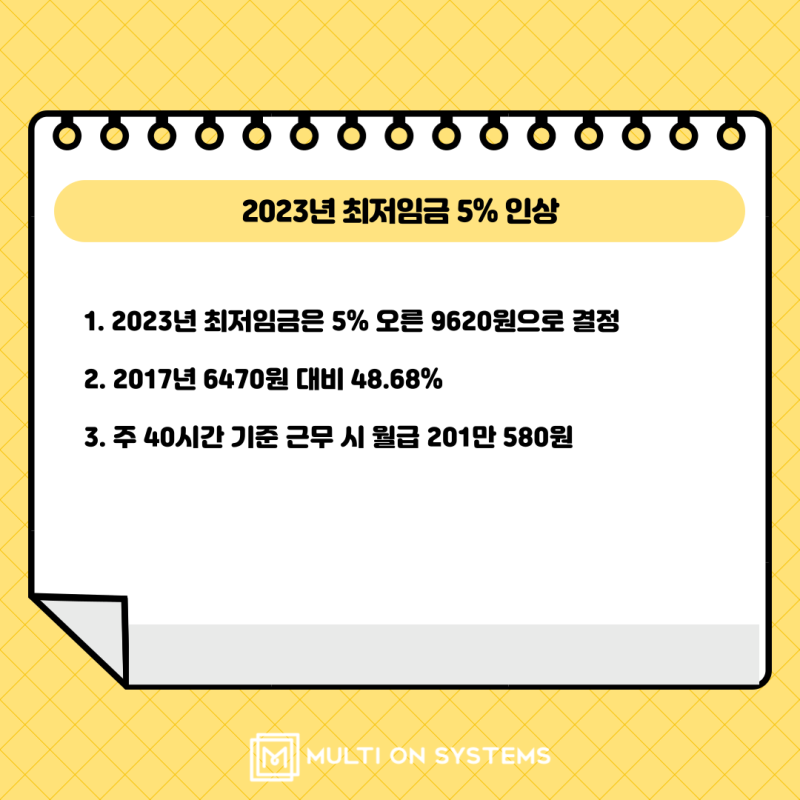 주 40시간 근무 알바 월급 201만 508원 2023년 최저임금은 2022년 대비 5 오른 9620원으로 결정되었습니다 2017년 6470원 대비 48 68 가 올랐는데요 9620원으로 계산해 보면 아르바이트 1명 주 40시간 기준 근무 시 주휴수당을 포함하여 월급을 201만 580원을 주어야 합니다 최저시급이 너무 올라서 아르바이트생 구하는 것도 무서울 지경입니다 이렇게 되면 야간에 운영해도 마진이 없어요 주휴수당이라도 폐지해 줬으면 좋겠습니다 최근 몇 년간 가파르게 치솟은 최저임금 탓에 안 그래도 수익을 확보하기가 어려웠는데 여기서 인건비가 또다시 오르면서 경제적 부담이 한층 커졌습니다 최근 소상공인 연합회에서 소상공