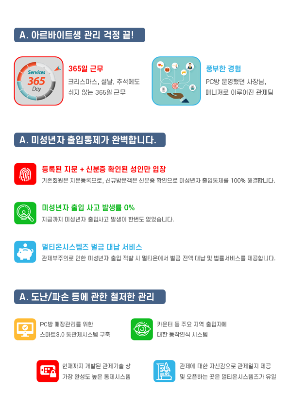 멀티온시스템즈는 지문등록을 통해 출입을 하고, 신규방문객은 CCTV를 통해 신분증확인 후 출입하고 있기 때문에 미성년자가 야간에 출입할 수 있는 가능성을 원천 차단합니다.