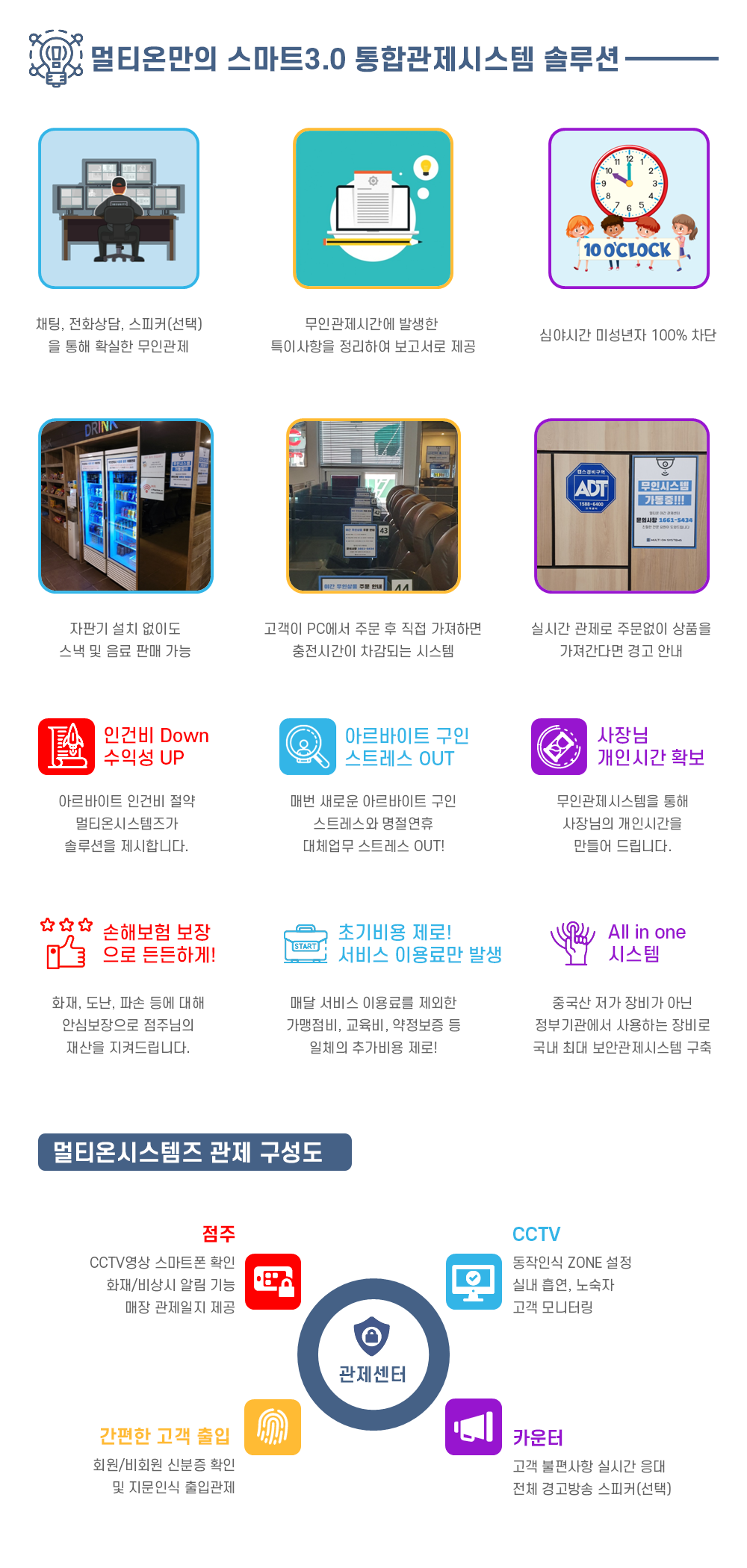 관제실에서 CCTV를 통해 PC방 내외부를 원격으로 관리해 주기 때문에 야간미성년자 출입 차단, 도난 및 분실 방지, 고객불편사항 접수 및 해소 등이 가능하기 때문에 매출하락 걱정이 없어 점주님들께 선호되고 있습니다.