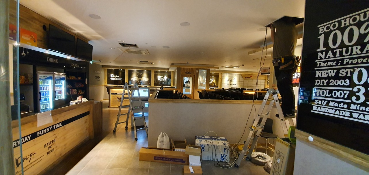 세종시 무인피시방, 무인관제시스템 설치 사진입니다. 천장에 CCTV를 설치하고 있습니다.