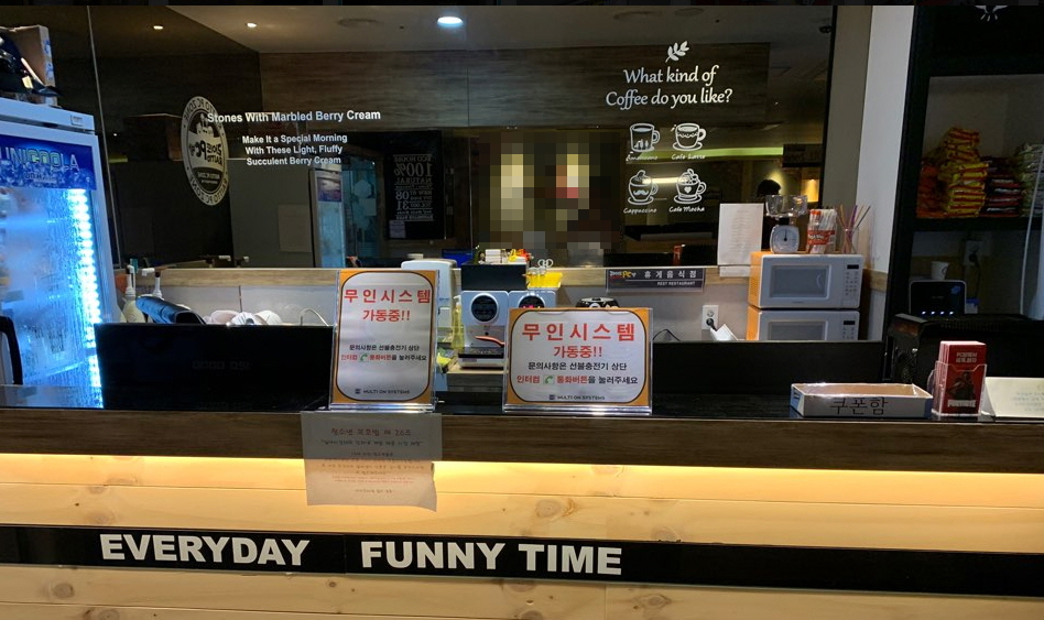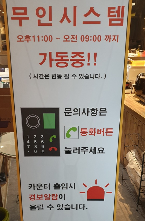 카운터, 카페 및 음식판매 하는 곳에 설치되어 있는 안내문입니다. 음식판매는 오픈형 셀프바 형태로 진행되며, CCTV를 통해 감독하고 있기 때문에 도난 우려를 바지할 수 있습니다.