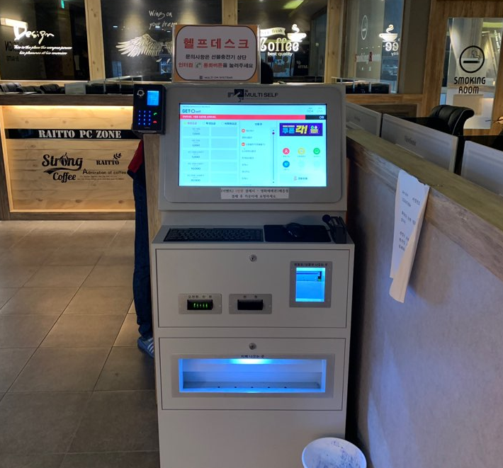 매장 내부에는 헬프데스크가 있습니다. 셀프피시방으로 이용요금을 정산하고, 음식을 먹은 후에도 마찬가지로 pc방 이용시간에 차감하는 시스템입니다.
