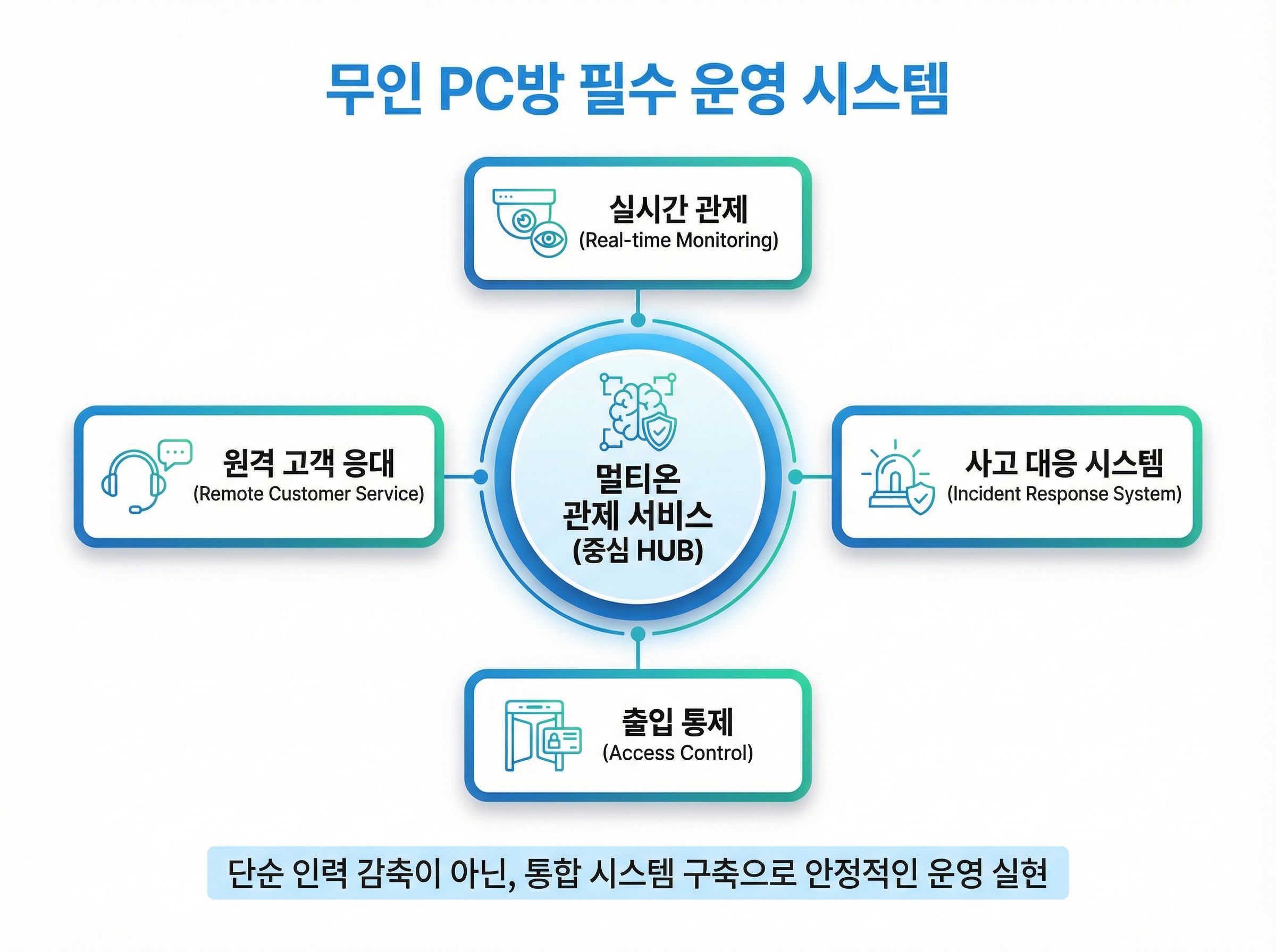 무인pc방의 핵심은 사람을 완전히 없애는 것이 아닙니다. 핵심은 사장님이 현장에 없어도 누군가 매장을 실시간으로 지키고 있어야 한다는 점입니다.
