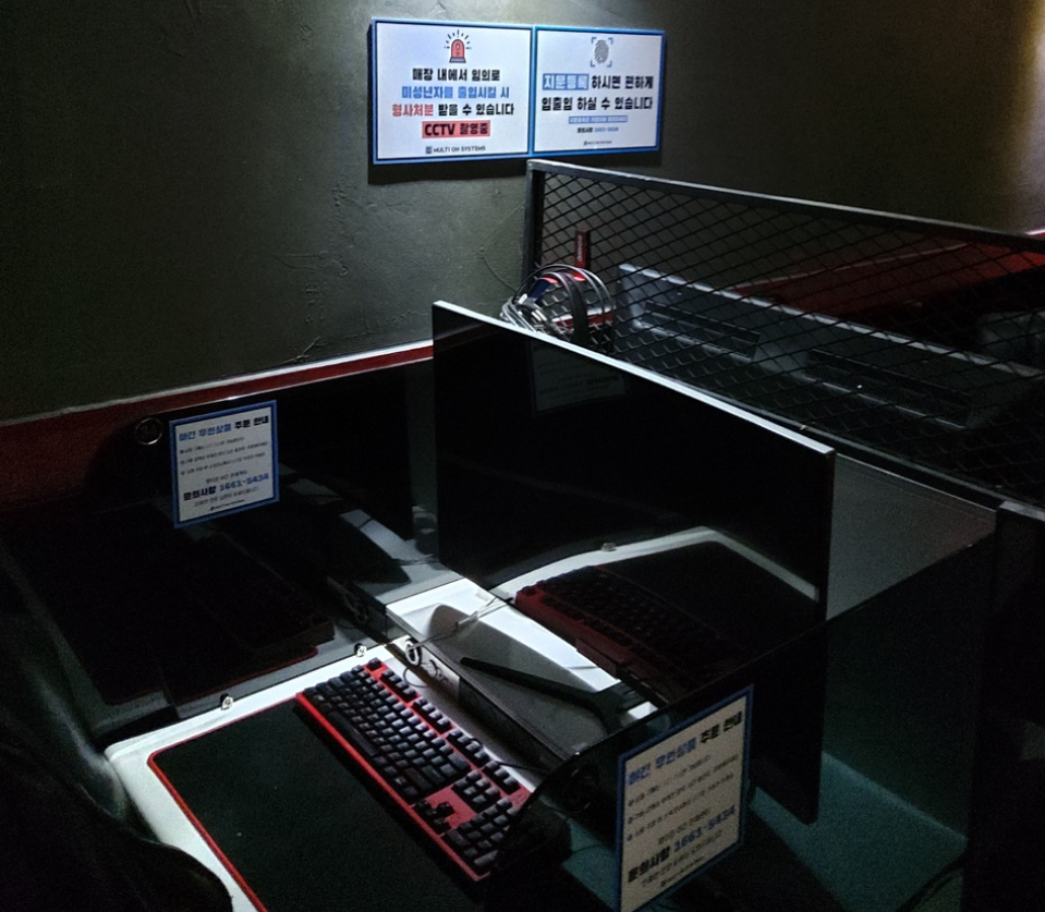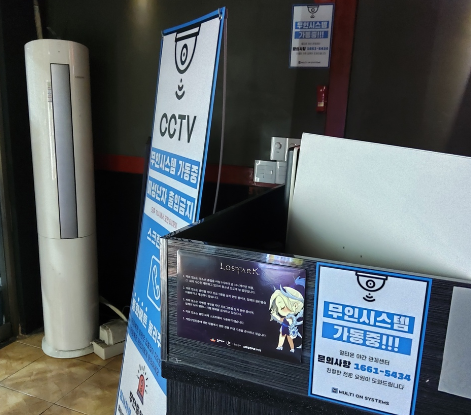 고양무인pc방 곧곧에는 멀티온시스템즈 무인관제시스템이 작동 중임을 알리는 안내문과 문의전화번호가 남겨져 있습니다. 문의사항이 생기시면 언제든지 전화주시기 바랍니다.