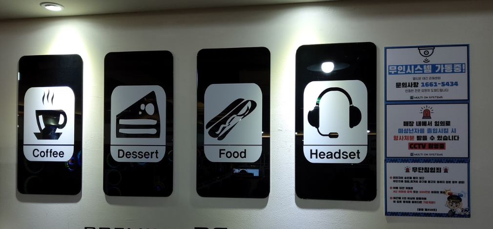 일산무인피시방 곧곧에는 무인관제시스템이 작동 중임을 알리는 안내문과 전화번호가 안내되어 있어, 문의사항이 있을 시 언제든지 문의하실 수 있습니다.