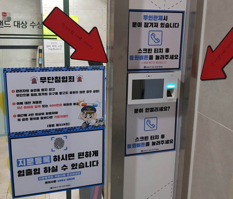 무인관제시간에는 문을 잠가 놓으며, 기존 방문객을 지문등록을 통해 자유롭게 출입할 수 있습니다. 신규방문객은 CCTV를 통해 관제실에 신분증 확인 후 문을 열어드립니다.
